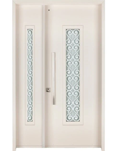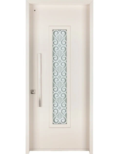 משקוף בקוו הקיר וזכוכית בידודית כפולה, שקופה או מגורענת, בצד מנעול.