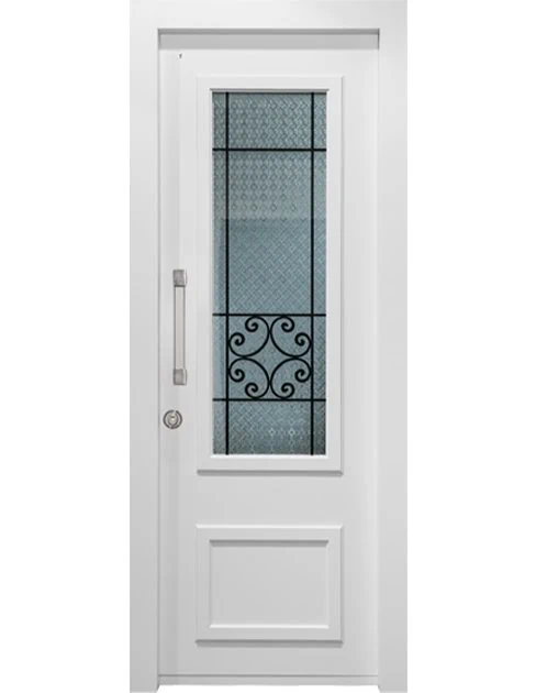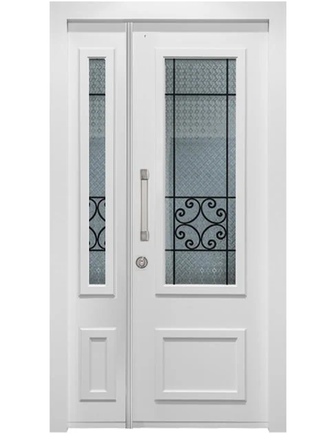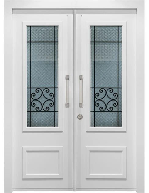 משקוף בקוו הקיר וזכוכית בידודית כפולה, שקופה או מגורענת, בצד מנעול.