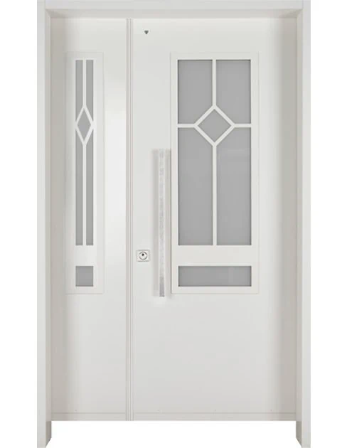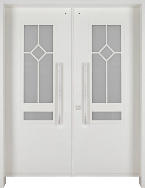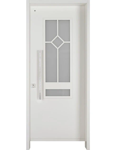 משקוף בקוו הקיר וזכוכית בידודית כפולה, שקופה או מגורענת, בצד מנעול.