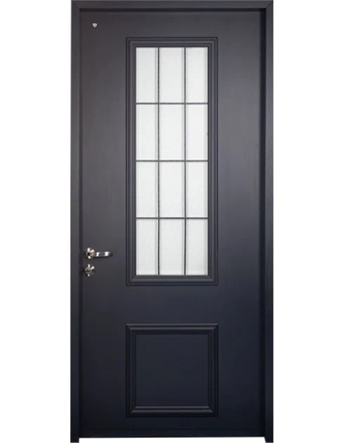 משקוף בקוו הקיר וזכוכית בידודית כפולה, שקופה או מגורענת, בצד מנעול.
