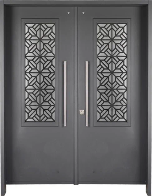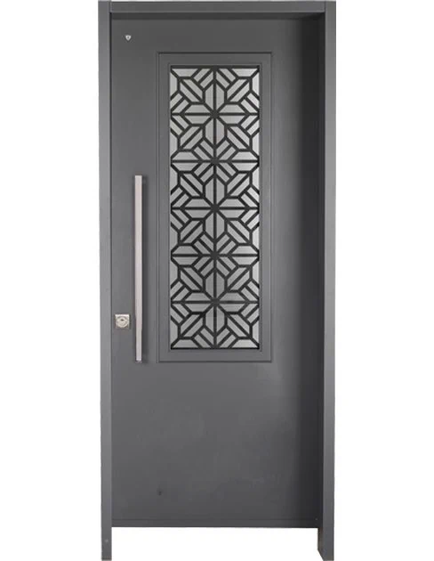 משקוף בקוו הקיר וזכוכית בידודית כפולה, שקופה או מגורענת, בצד מנעול.